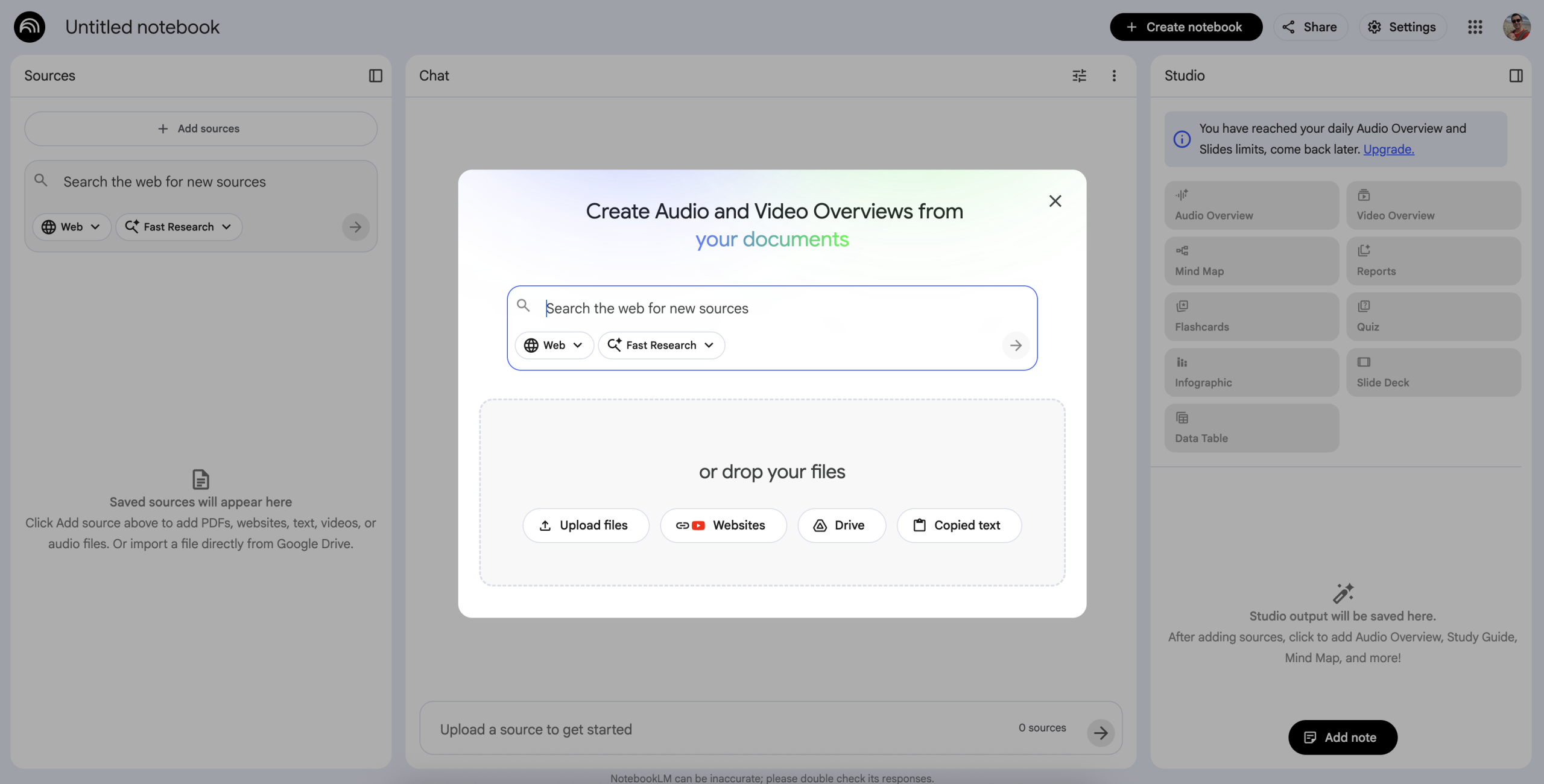 NotebookLM is free to use with a standard Google account, and users with Google Workspace for Education accounts receive access with relatively generous but finite daily limits. These limits become noticeable when generating multiple audio overviews or slide decks in a single day.
