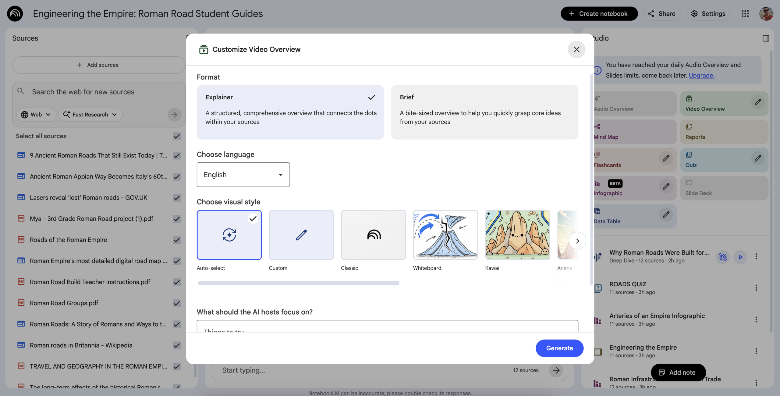 The tool works best when the inputs are informational in nature. Content that clearly explains concepts or facts tends to produce strong outputs, while instructional documents such as lesson plans or pedagogical notes can sometimes confuse the system and lead to less useful results. Careful source selection is critical, especially when using the built in web search, since irrelevant, untimely, or fictitious context sources can unintentionally steer outputs in the wrong direction.
